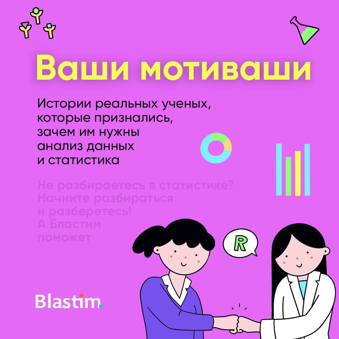 А Бластим готов не просто учить статистике, но и копаться с вами в ваших же данных. На онлайный курс «Статистика, R и анализ данных» вы можете прийти в охапку со своими табличками и практиковаться прямо на них. Ведь на своем, знакомом и родном ботать гораздо эффективнее. Программируйте, анализируйте, задавайте вопросы и получайте экспертную поддержку. Можно хоть диссер написать при помощи наших преподавателей и ассистентов 😎